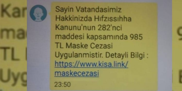 Kars İl Emniyet Müdürlüğü Siber Suçlarla Mücadele Şube Müdürlüğü ekipleri, vatandaşların cep telefonlarına kısa mesaj (SMS) olarak gelen “Sayın vatandaşımız Hakkınızda Hıfzıssıhha Kanunu’nun 282’ni maddesi kapsamında 985 TL Maske Cezası uygulanmıştır. Detaylı Bilgi: https://www.kisa.link/maskecezasi” bildirime itibar edilmemesini bildirildi.