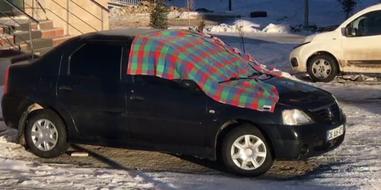 Soğuk hava hayatı olumsuz etkilemeye devam ediyor. Vatandaşlar evlerinin önüne park ettikleri araçlarını donmasın diye üzerine evlerinde buldukları battaniye, çadır, kilim ve halıları araçlarının üzerine örterek soğuktan korumaya çalışıyor. Üzerleri örtülü araçlar ise görenleri şaşırtıyor.