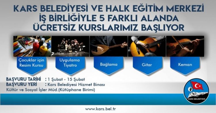 Kars Valisi ve Belediye Başkan Vekili Türker Öksüz'ün talimatlarıyla resim, tiyatro, bağlama, gitar ve keman gibi 5 farklı dalda sertifikalı ve ücretsiz kültür sanat kursu açılacağı bildirildi.