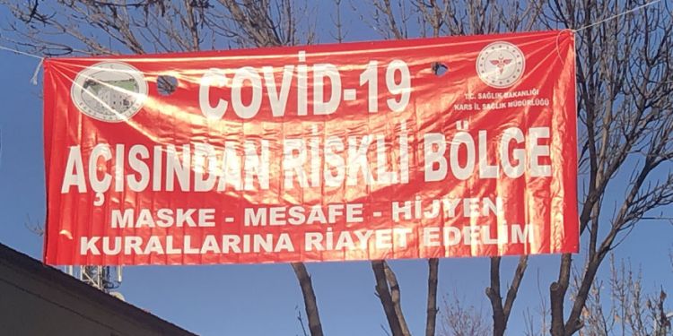 Kars'ta Korona virüs (Covid-19) ile mücadele kapsamında İl Sağlık Müdürlüğü'nce Covid-19 vakalarının yoğun olduğu cadde ve mahallelere üzerinde Kovid-19 açısından riskli bölge" maske-mesafe-hijyen kurallarına riayet edelim" yazılı afiş asılarak vatandaşlar uyarıldı.