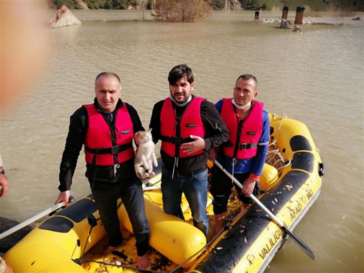 Sarıkamış Karakurt Barajı’nın su tutmaya başlaması ile birlikte baraj suyunun altında kalan bir evin çatısında mahsur kalan kedi Karakurt Jandarma Komutanlığı ve Kars AFAD tarafından bot yardımıyla kurtarılarak kıyıya çıkarıldı.