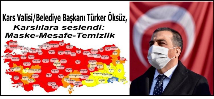 Kars Valisi/Belediye Başkanı Türker Öksüz, Karslılara seslenerek: “Kıymetli hemşehrilerim; Maalesef Yüksek Riskli İl (turuncu ) kategorisinde yer alıyoruz. Düşük Riskli Kategoriye (Mavi) dönüşmemiz için alınan tedbirlere ve MASKE, MESAFE, TEMİZLİK kurallarına hassasiyetle uyulmasını önemle rica ediyorum. Vakalarda yaşanan artış sonucunda Orta riskli (sarı) kategorisinde bulunan Kars, yüksek riskli (turuncu) kategorisine yükseldi. Karslı vatandaşlarımızın mutlaka maske-mesafe-temizlik kurallarına uymasını önemle istiyoruz. Sağlık Bakanı Fahrettin Koca'nın illerin risk durumunu gösteren son paylaştığı haritaya göre, Orta riskli (sarı) kategorisinde bulunan Kars, yüksek riskli (turuncu) kategorisine yükseldi.”dedi.